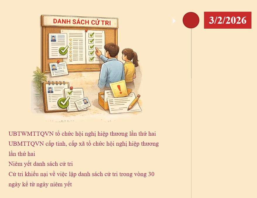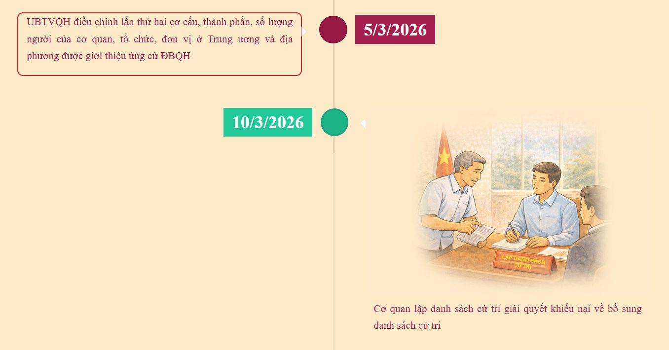 Cuộc bầu cử ĐBQH khóa XVI và đại biểu HĐND các cấp nhiệm kỳ 2026-2031 là sự kiện chính trị trọng đại của đất nước diễn ra ngay sau Đại hội lần thứ XIV của Đảng. Đây là đợt sinh hoạt dân chủ sâu rộng trong nhân dân nhằm phát huy quyền làm chủ, lựa chọn những người tiêu biểu, xứng đáng, đại diện cho ý chí, nguyện vọng và quyền làm chủ của nhân dân. Dưới đây là các mốc thời gian trước khi diễn ra cuộc bầu cử ĐBQH khóa XVI và đại biểu HĐND các cấp nhiệm kỳ 2026-2031.