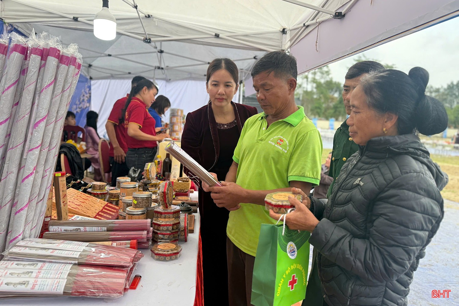 Bên cạnh đó, khu vực trưng bày sản phẩm truyền thống cũng thu hút đông đảo khách tham quan với các đặc sản tiêu biểu của vùng đất Hương Khê. Từ trầm hương, mật ong, mật mía, kẹo cu đơ đến giò chả hay cam Khe Mây… Tất cả đều là những sản phẩm đã được công nhận đạt chuẩn OCOP.