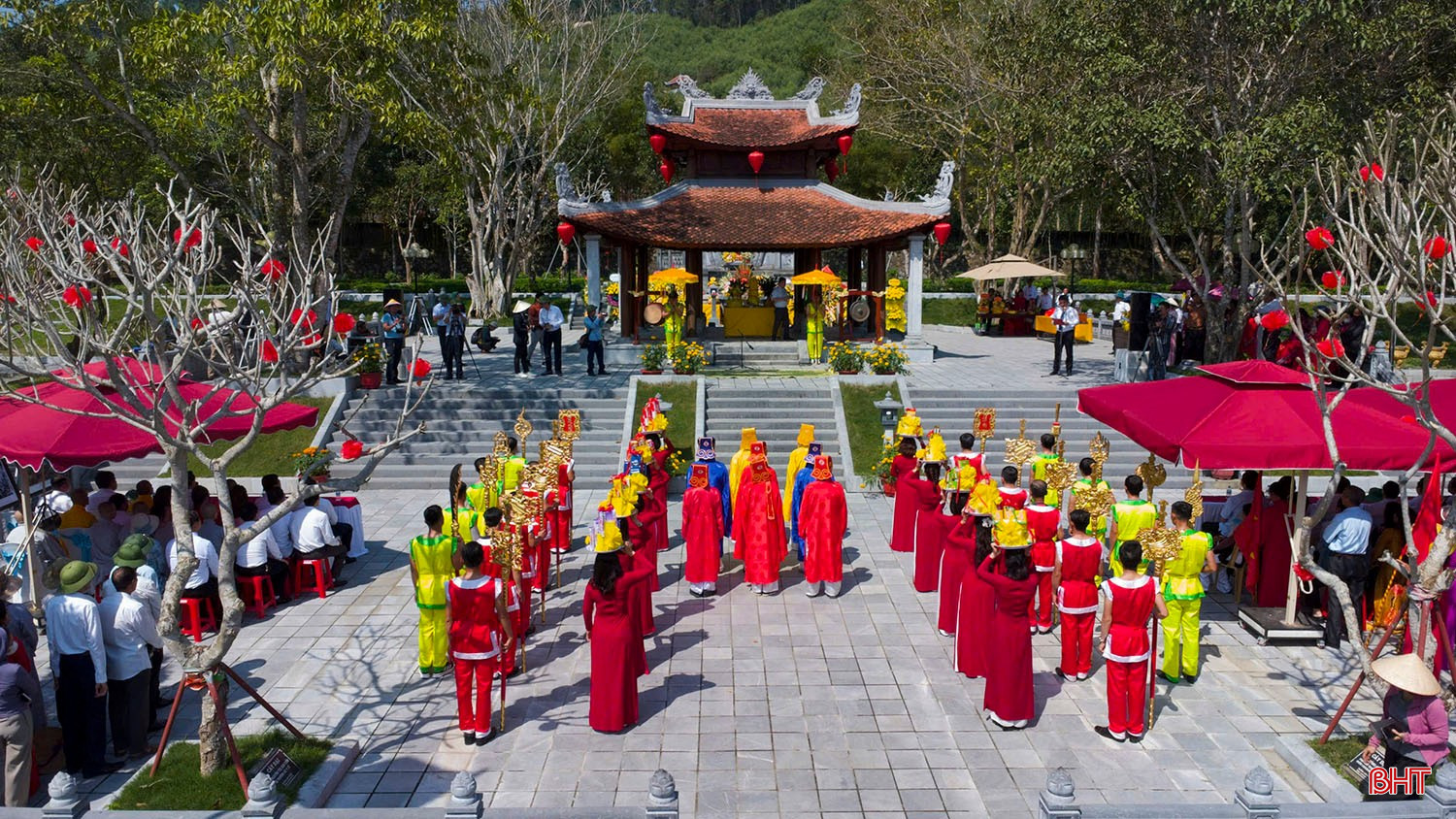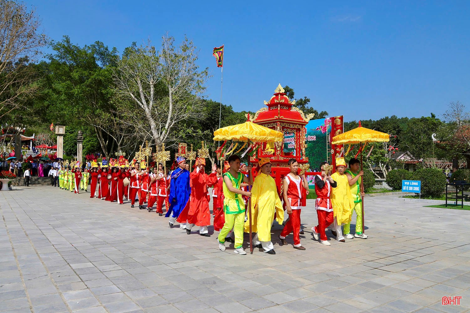 Đoàn rước tiến vào khuôn viên nhà lưu niệm Lê Hữu Trác tại xã Sơn Giang.