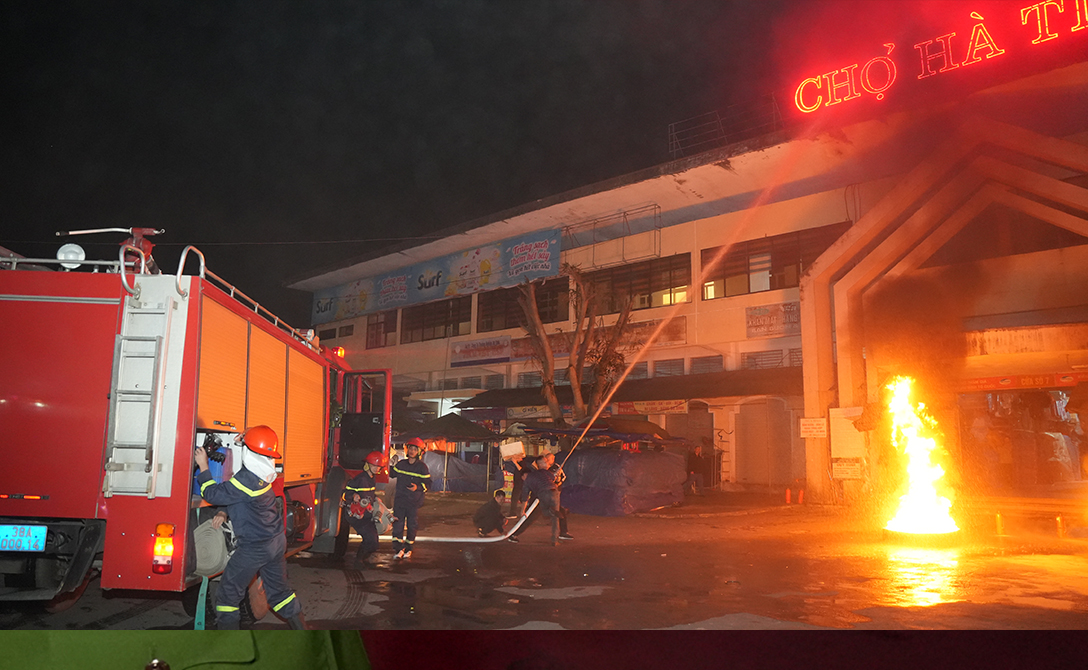 Điểm nhấn của buổi diễn tập là tình huống giả định xảy ra cháy tại một khu vực kinh doanh trong chợ. Ngay khi phát hiện sự cố, Ban Quản lý chợ và lực lượng bảo vệ đã nhanh chóng triển khai các biện pháp chữa cháy ban đầu, tổ chức hướng dẫn tiểu thương và người dân thoát nạn an toàn, đồng thời báo tin cho lực lượng Cảnh sát PCCC và CNCH. Nhận được tin báo, Phòng Cảnh sát PCCC và CNCH Công an tỉnh Hà Tĩnh đã điều động 3 xe chữa cháy chuyên dụng cùng hàng chục cán bộ, chiến sĩ nhanh chóng có mặt tại hiện trường, triển khai đội hình chữa cháy, phối hợp chặt chẽ với Ban Quản lý chợ để khống chế và dập tắt đám cháy trong thời gian ngắn, bảo đảm an toàn về người và tài sản.