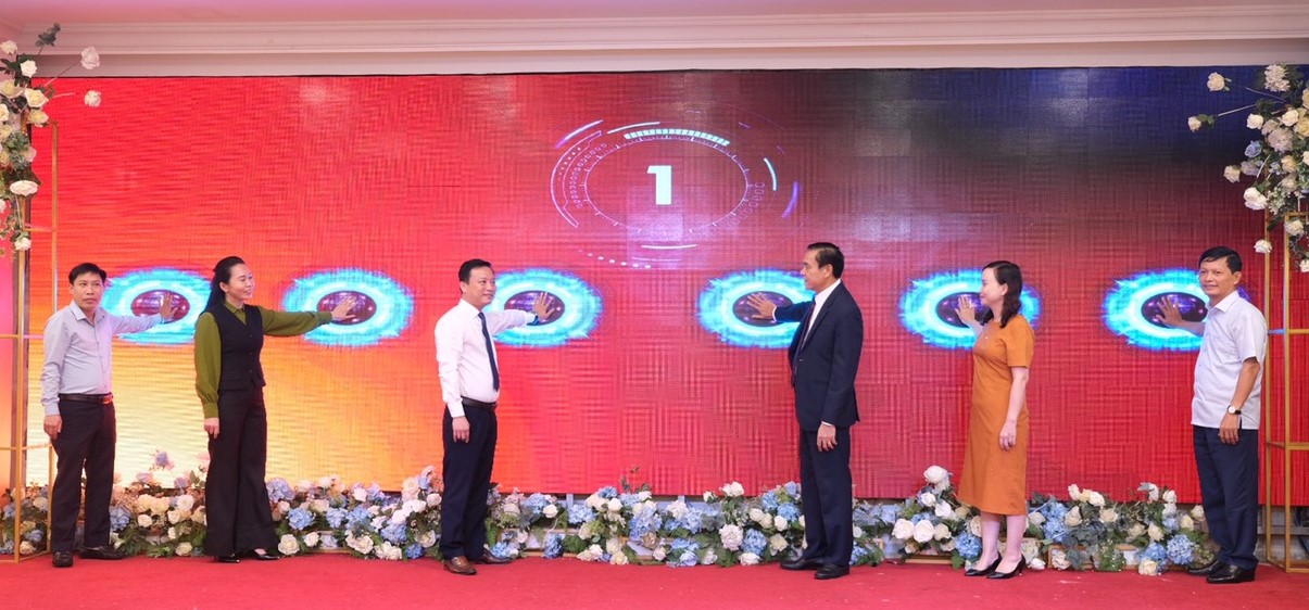Các đồng chí lãnh đạo tỉnh và sở ngành nhấn nút phát động hưởng ứng Ngày Chuyển đổi số quốc gia năm 2023 trên địa bàn tỉnh