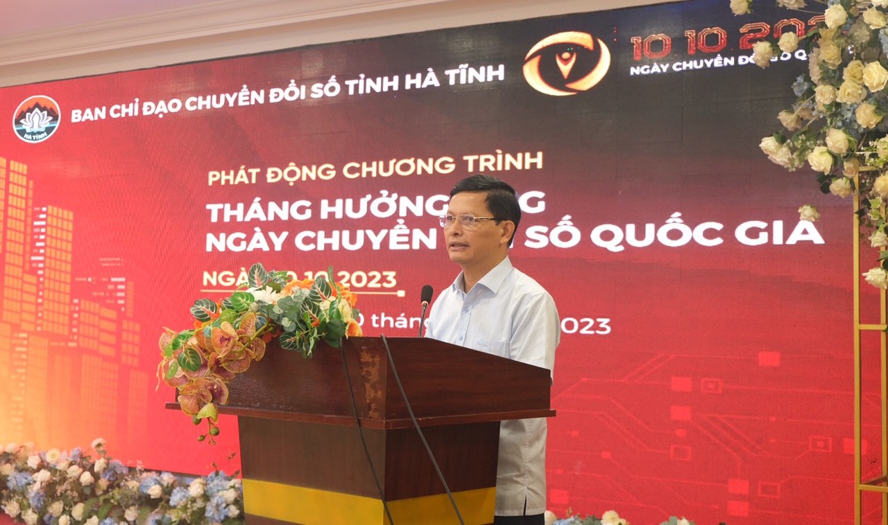Chiều 10/10, Ban Chỉ đạo chuyển đổi số tỉnh Hà Tĩnh tổ chức Lễ phát động hưởng ứng Ngày Chuyển đổi số quốc gia trên địa bàn tỉnh Hà Tĩnh năm 2023. Dự chương trình có đồng chí: Võ Trọng Hải- Chủ tịch UBND tỉnh, Trưởng BCĐ Chuyển đổi số tỉnh; các đồng chí lãnh đạo HĐND, UBND tỉnh; thành viên Tổ giúp việc Ban Chỉ đạo về CĐS số tỉnh, Tổ công tác Đề án 06 của tỉnh; lãnh đạo các sở, ngành, các huyện, thành phố.