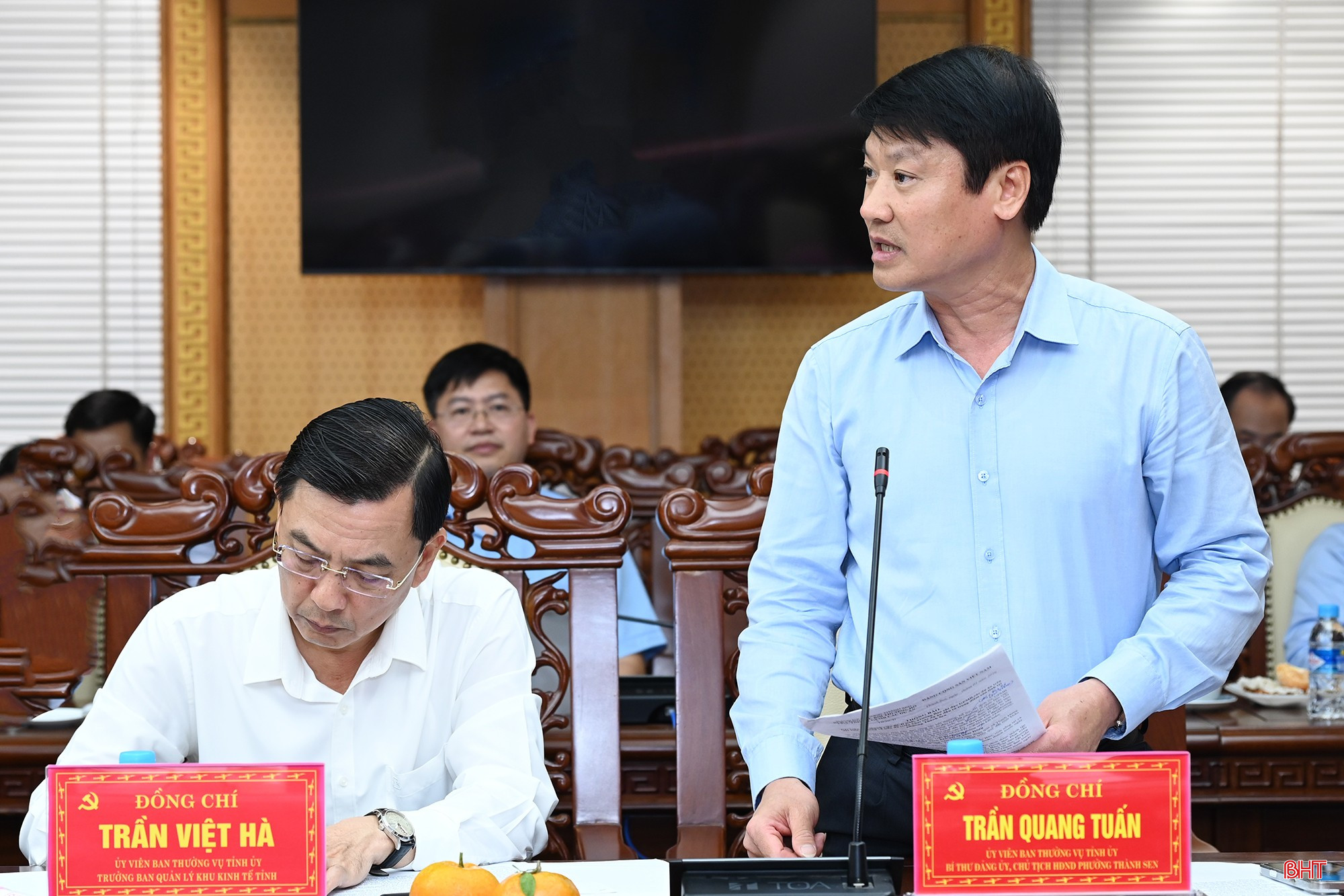 Đồng chí Trần Quang Tuấn - Ủy viên Ban Thường vụ Tỉnh ủy, Bí thư Đảng ủy phường Thành Sen; Bí thư Đảng ủy phường Vũng Áng Trần Xuân Phượng và Giám đốc Sở Nội vụ Trịnh Văn Ngọc phát biểu làm rõ thêm các nội dung đoàn công tác nêu tại buổi làm việc.