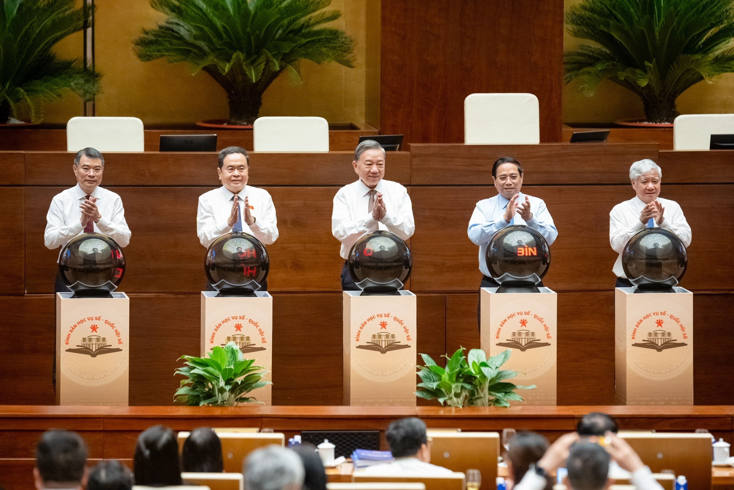 Tổng Bí thư Tô Lâm, Thủ tướng Chính phủ Phạm Minh Chính và Chủ tịch Quốc hội Trần Thanh Mẫn cùng Lãnh đạo, Đảng, Nhà nước thực hiện nghi thức bấm nút khai trương Nền tảng “Bình dân học vụ số - Quốc hội số"