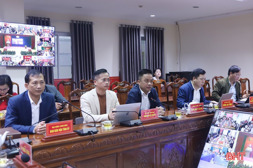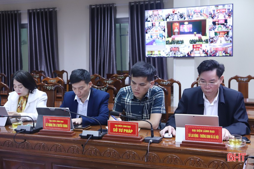 Đại biểu Hà Tĩnh theo dõi hội nghị qua màn hình trực tuyến.