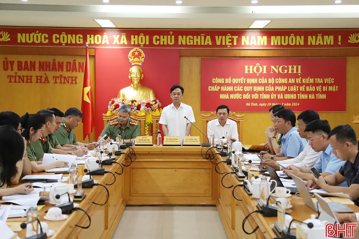 Sáng 29/7, Tỉnh ủy, UBND tỉnh Hà Tĩnh phối hợp với Bộ Công an tổ chức hội nghị công bố quyết định của Bộ Công an về kiểm tra việc chấp hành các quy định của pháp luật về bảo vệ bí mật Nhà nước đối với Tỉnh ủy và UBND tỉnh.