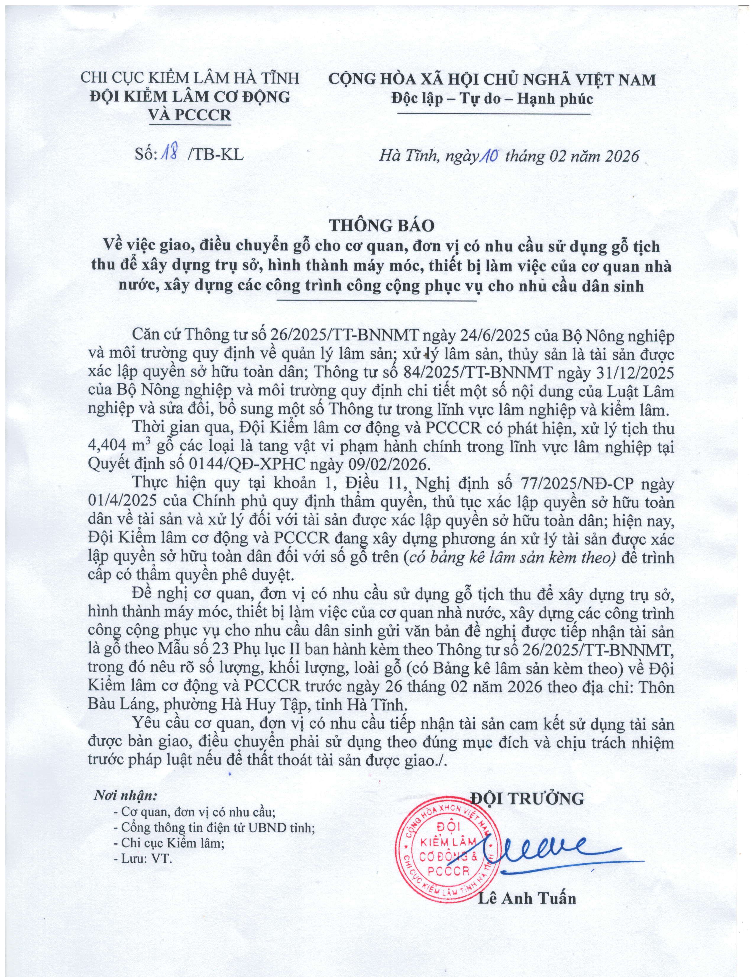 Thông báo giao, điều chuyển gỗ tịch thu phục vụ xây dựng trụ sở và công trình công cộng