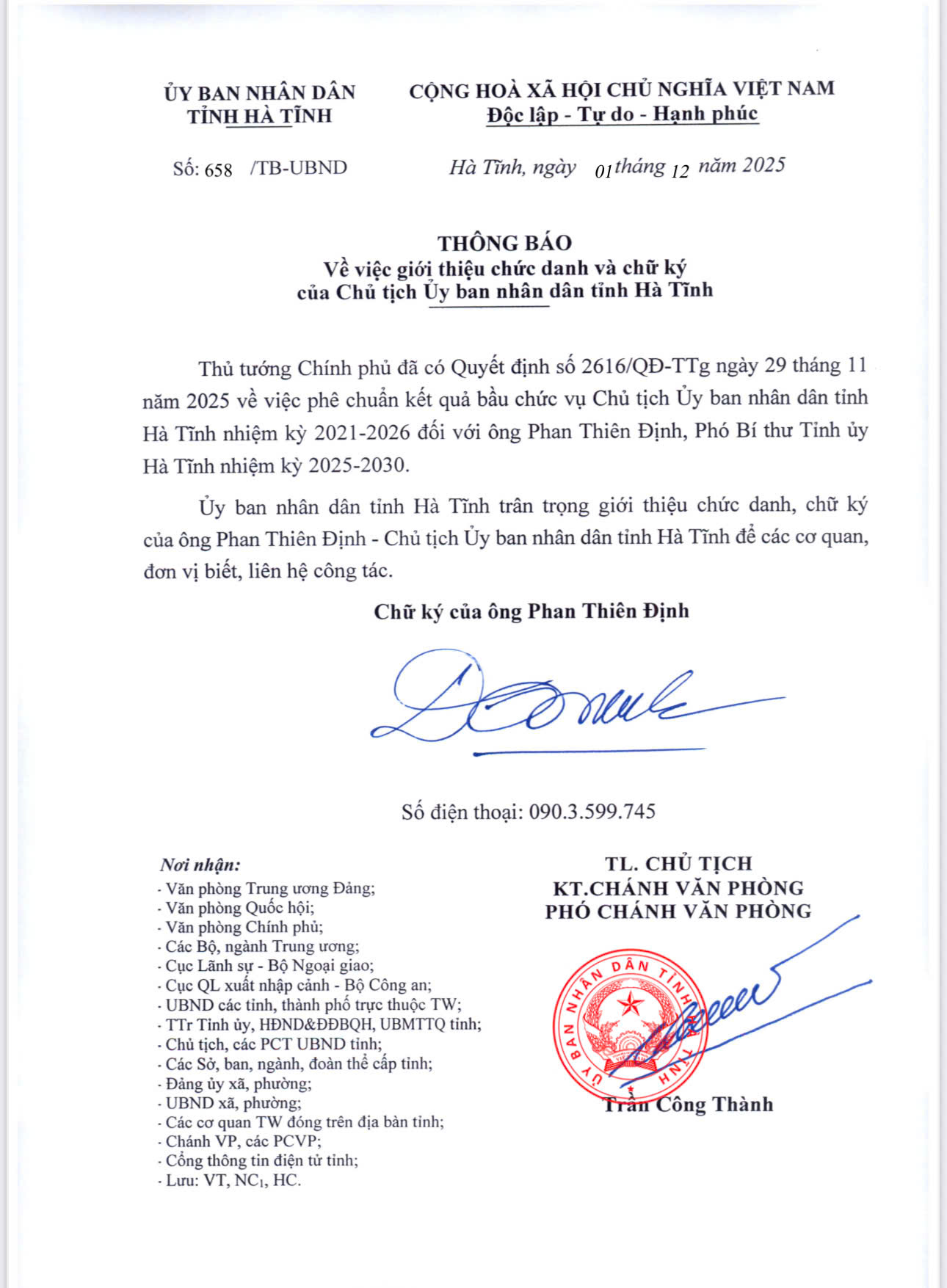 Thông báo giới thiệu chức danh và chữ ký của Chủ tịch UBND tỉnh Hà Tĩnh
