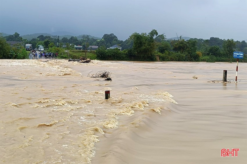 Mưa lớn khiến nước sông dâng cao đã gây ngập cầu tràn Mỹ Thuận ở xã Kỳ Sơn, huyện Kỳ Anh từ sáng 5/11.