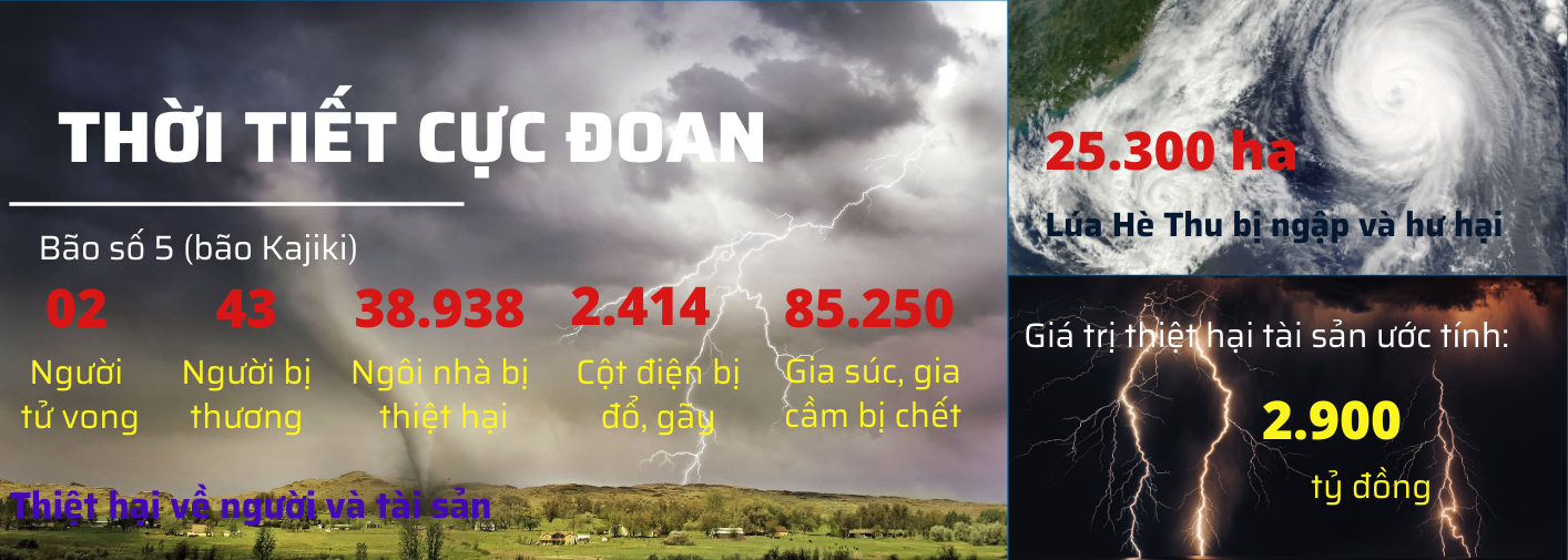 - Về nông, lâm nghiệp, thủy sản: Có khoảng 25.300ha lúa và 2.000ha rau màu bị ngập, đổ ngã, ảnh hưởng đến năng suất; 4.400 ha cây ăn quả tập trung, và 23.000ha cây lâm nghiệp bị đổ, gãy; hơn 250 con gia súc và khoảng 85.000 con gia cầm bị thiệt hại; lương thực bị ẩm ướt, hư hỏng hơn 15 tấn; khoảng 280ha nuôi cá truyền thống, 230 ha nuôi tôm, 99 tàu cá bị chìm đắm, vở, hư hỏng và nhiều lồng bè, tàu, thuyền, ngư cụ của ngư dân bị ảnh hưởng.