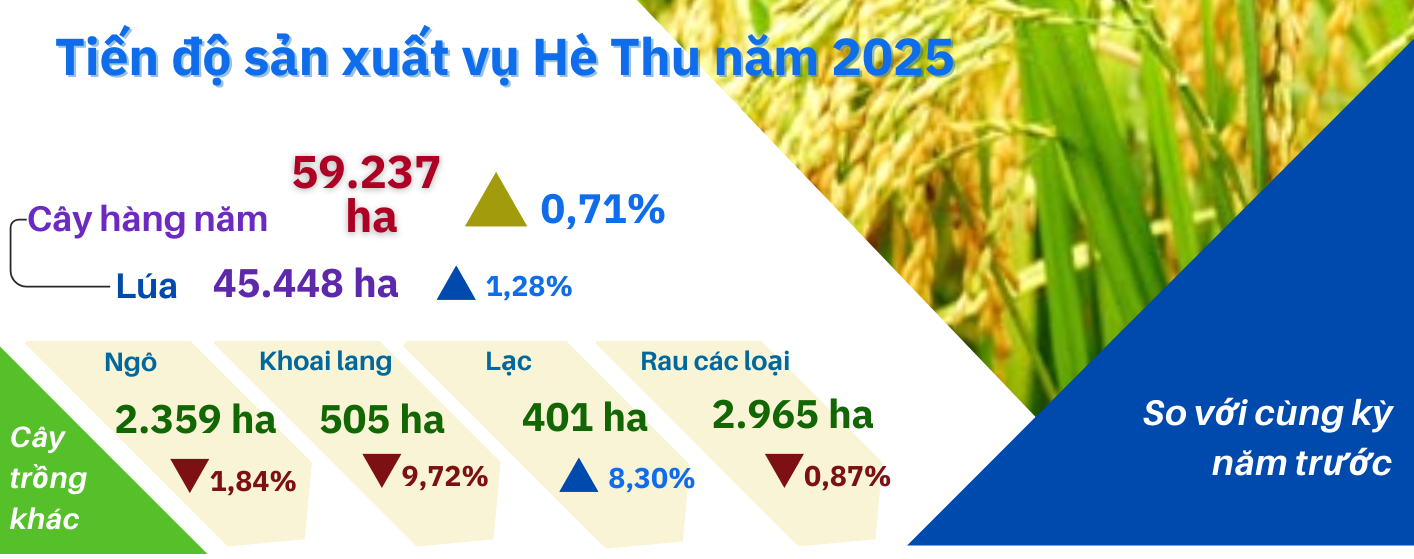 Cây lúa: Tổng diện tích gieo trồng lúa toàn tỉnh ước tính đạt 45.448 ha, tăng 1,28% (tăng 574 ha) so với cùng kỳ năm trước. Diện tích tăng do một số địa phương đã ban hành chính sách hỗ trợ, khuyến khích nông dân tích cực gieo trồng vụ Hè Thu, góp phần mở rộng diện tích và thúc đẩy sản xuất nông nghiệp.