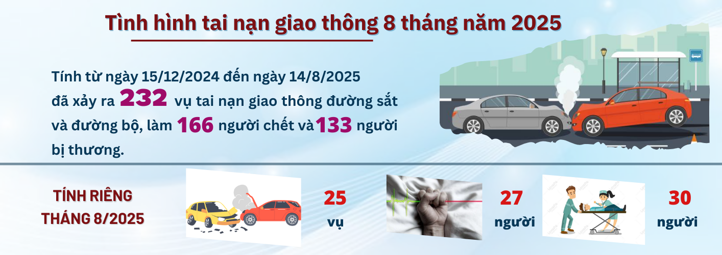 Tính chung 8 tháng năm 2025 trên địa bàn đã xảy ra 230 vụ tai nạn đường bộ, làm 166 người chết, 132 người bị thương; 2 vụ tai nạn đường sắt, làm 1 người bị thương. Tổng giá trị thiệt hại ước 3.358 triệu đồng