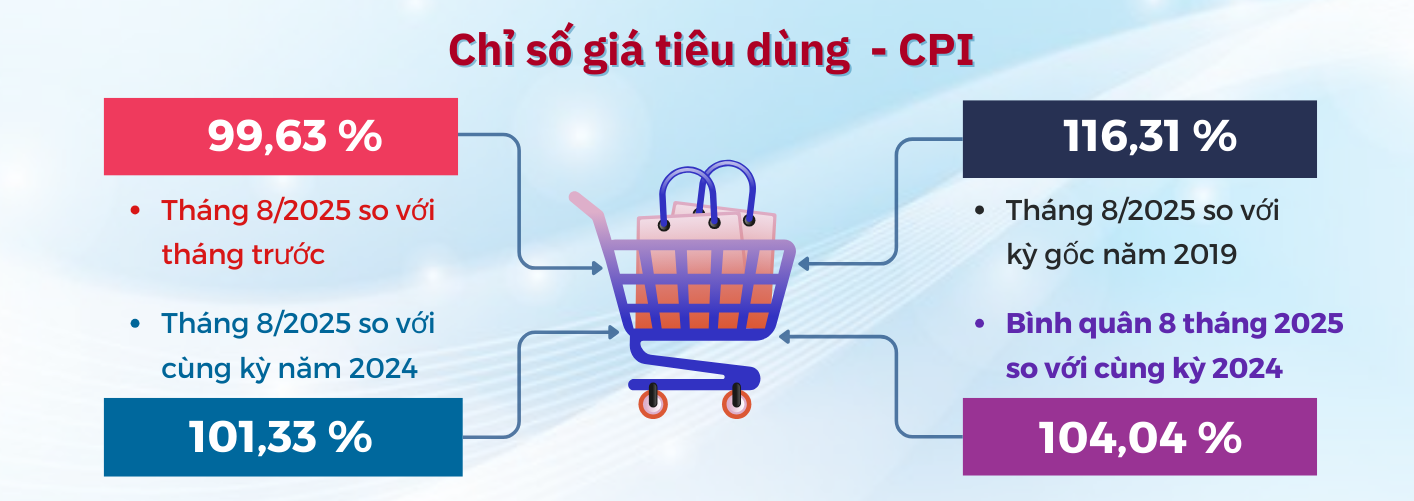 Bình quân tám tháng năm 2025 tăng 4,04% so với cùng kỳ năm trước, trong đó: Khu vực thành thị tăng 5,45%, khu vực nông thôn tăng 3,43%. Chủ yếu do giá lương thực, thực phẩm, điện sinh hoạt, dịch vụ giáo dục, dịch vụ y tế là yếu tố tác động làm tăng CPI.
