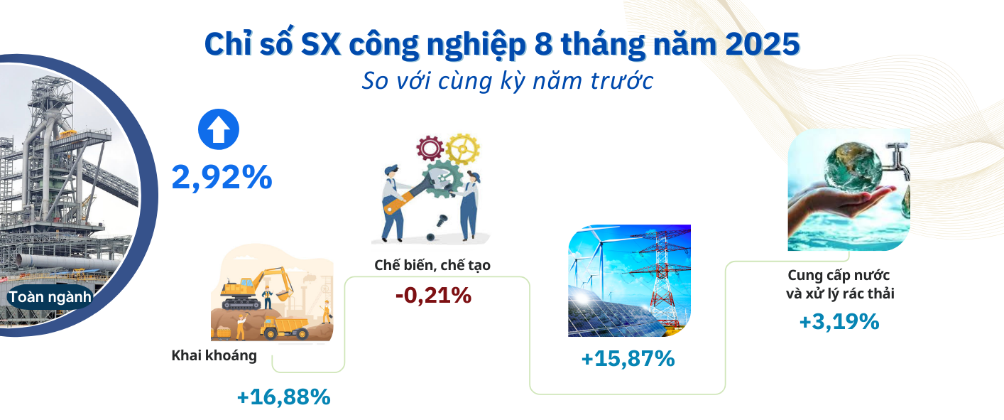 Ước tính tháng 8/2025, chỉ số sản xuất toàn ngành tăng 9,53% so với tháng trước. So với cùng kỳ năm trước ước giảm 1,46%. Trong đó: Ngành công nghiệp khai khoáng ước tăng 4,76% so với tháng trước và tăng 11,56% so với cùng kỳ; ngành công nghiệp chế biến chế tạo ước giảm 1,59% so với tháng trước và giảm 14,74% so với cùng kỳ; ngành sản xuất và phân phối điện dự tính tăng 78,66% so với tháng trước và tăng 96,88% so với cùng kỳ; ngành cung cấp nước và xả lý rác thải dự ước giảm 0,79% so với tháng trước và so với cùng kỳ năm trước giảm 0,49%.
