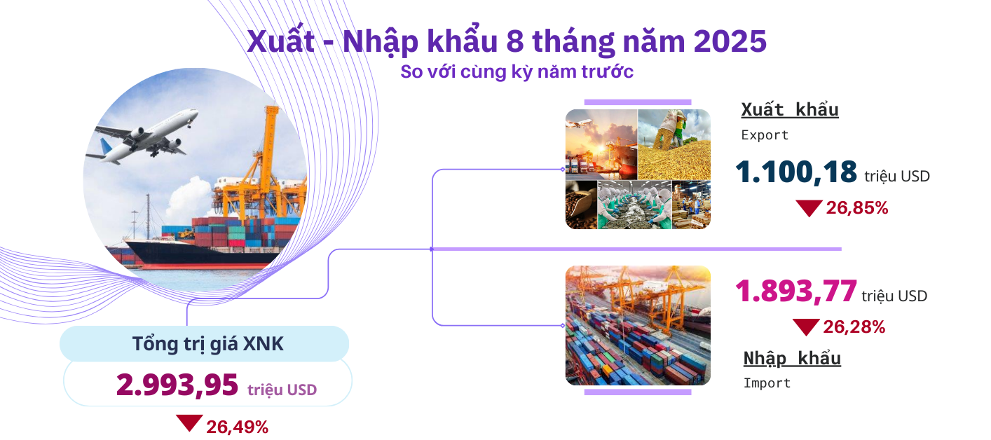 Tám tháng năm 2025, tổng trị giá xuất nhập khẩu đạt 2.993,95 triệu USD, giảm 26,49% so với cùng kỳ năm trước (trị giá nhập khẩu giảm 26,28% và trị giá xuất khẩu giảm 26,85%. Nguyên nhân chính là do Công ty TNHH Gang thép Hưng Nghiệp Formosa Hà Tĩnh (FHS) gặp khó khăn trong xuất khẩu thép và phôi thép do các chính sách bảo hộ thương mại quốc tế, dẫn đến giảm sản lượng và nhu cầu nhập khẩu nguyên liệu.