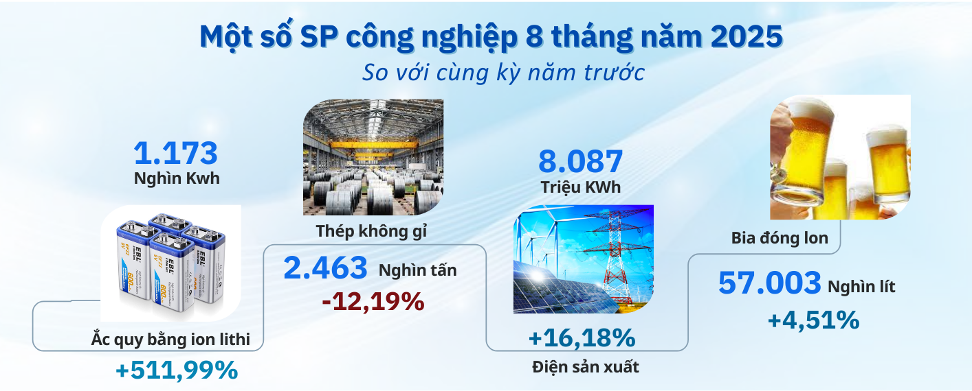 Một số sản phẩm công nghiệp 8 tháng năm 2025 giảm so với năm trước: Quặng zircon và tinh quặng zircon giảm 10,55%; thép không gỉ ở dạng bán thành phẩm giảm 12,19%; vỏ bào, dăm gỗ giảm 11,85%; quặng inmenit và tinh quặng inmenit giảm 32,54%.