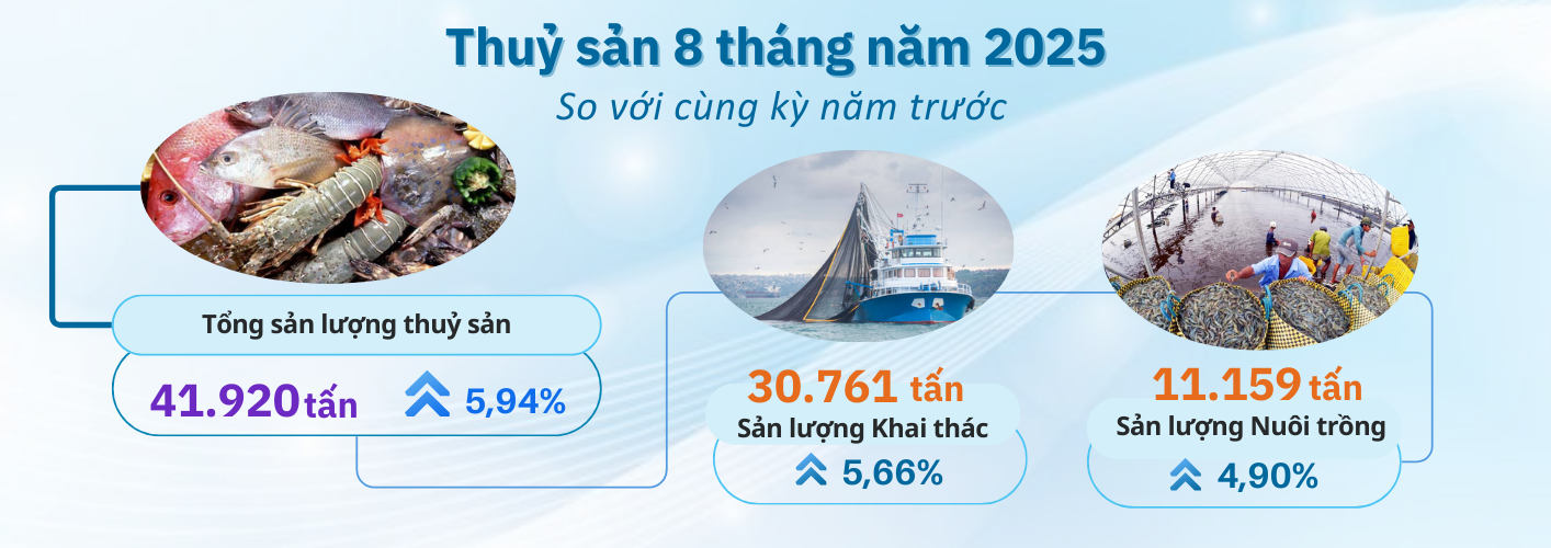 Sản lượng thủy sản: Tháng 8/2025 ước đạt 6.921 tấn, tăng 5,26% so với cùng kỳ năm trước, trong đó: Cá ước đạt 3.787 tấn, tăng 6,64%; tôm ước đạt 1.748 tấn, giảm 2,33%; thủy sản khác ước đạt 1.386 tấn, tăng 1,99%. Sản lượng thủy sản nuôi trồng ước đạt 2.757 tấn, tăng 6,49% so với cùng kỳ năm trước. sản lượng thủy sản khai thác ước đạt 4.164 tấn, tăng 5,74% so với cùng kỳ năm trước.