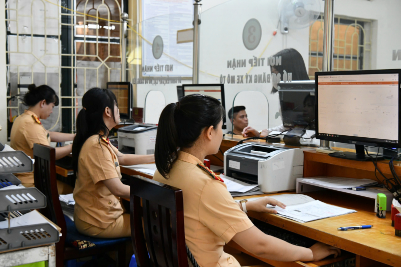 Các cán bộ CSGT thực hiện thủ tục hành chính cho người dân.