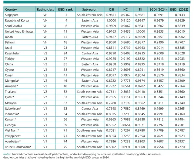 Trong bảng xếp hạng năm 2024, Việt Nam đứng vị trí thứ 71 trong 193 quốc gia thành viên Liên hợp quốc, tăng 15 bậc so với năm 2022. Với kết quả này, Việt Nam lần đầu tiên được xếp vào nhóm EGDI ở mức Rất cao và vươn lên vị trí xếp hạng cao nhất kể từ khi bắt đầu tham gia đánh giá EGDI của Liên hợp quốc năm 2003.