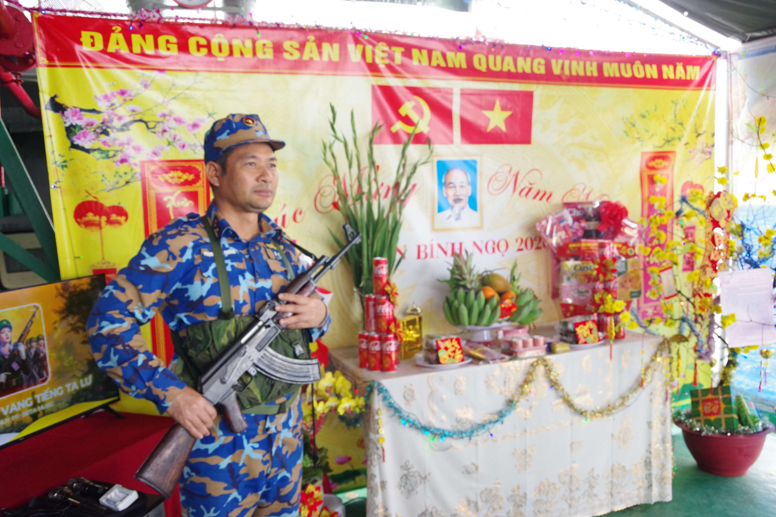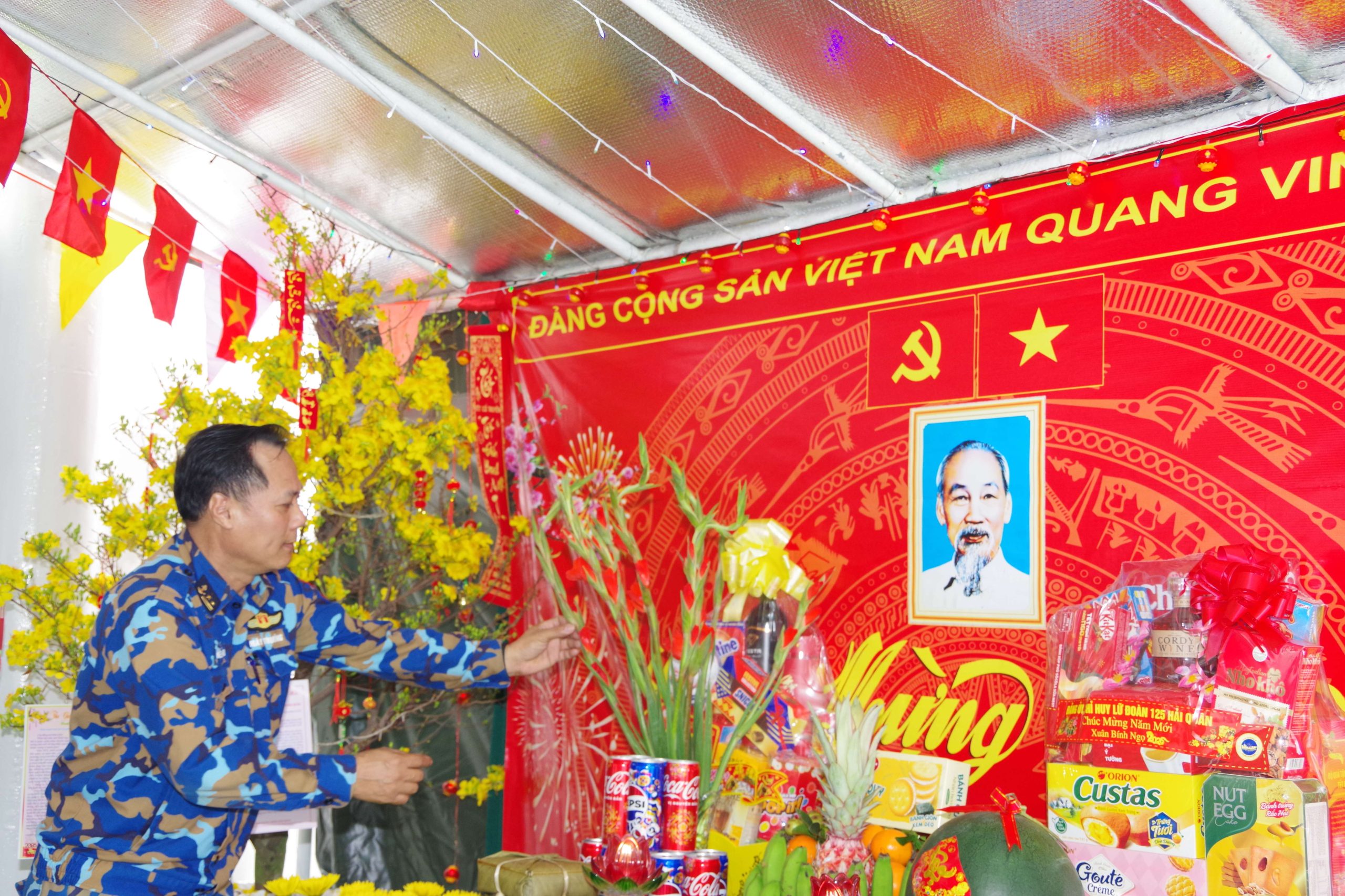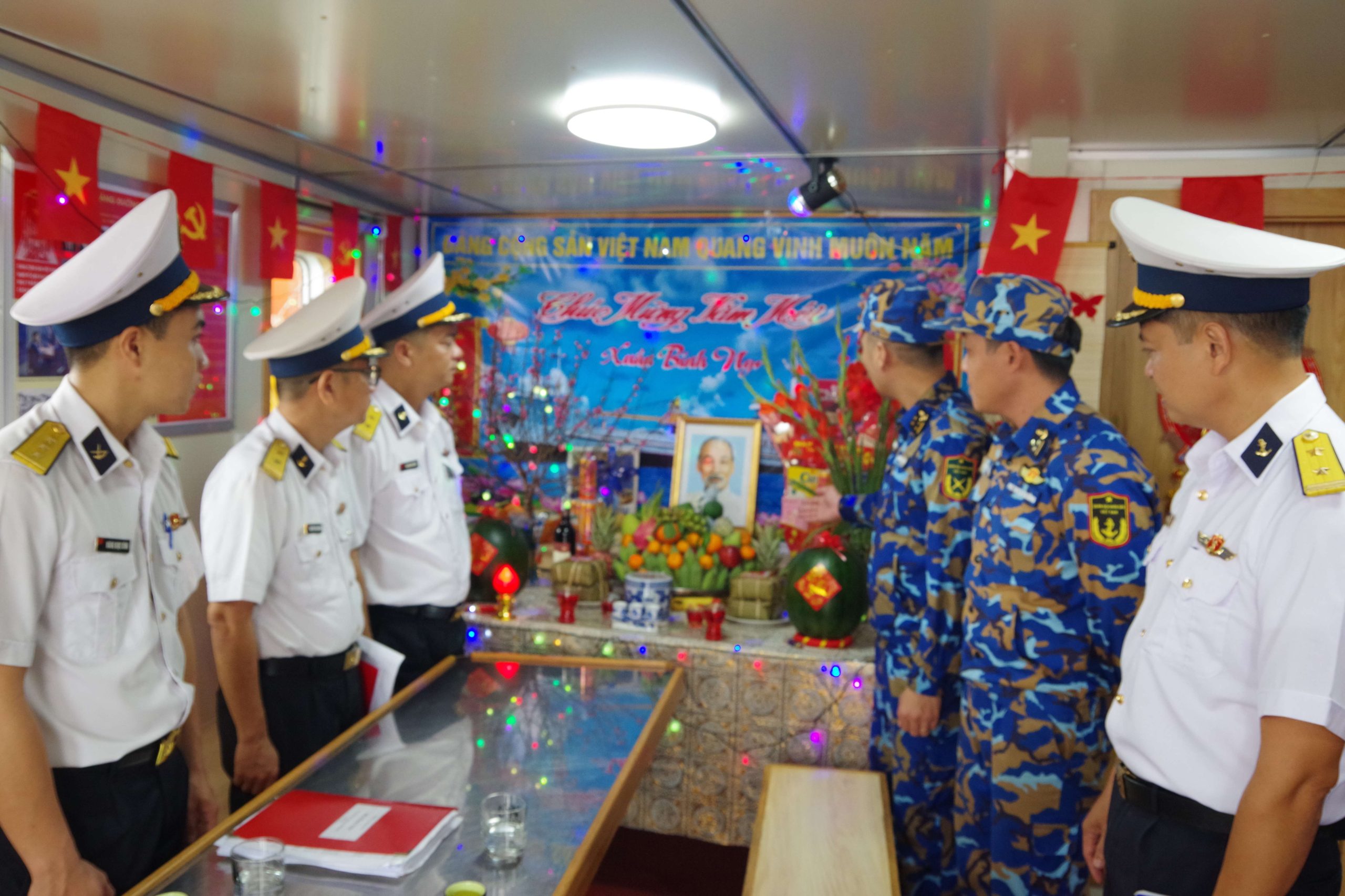 Trong cái se lạnh của những ngày giáp Tết, Đoàn cơ sở Lữ đoàn phát động Hội thi “Phòng đón Xuân” – hoạt động thường niên mang đậm bản sắc văn hóa quân đội. Từ sáng sớm, phòng sinh hoạt chung trên các tàu, Phòng Hồ Chí Minh tại các hải đội đã rộn ràng tiếng nói cười. Người lau chùi doanh cụ, chỉnh trang nội vụ; người khéo léo uốn lại cành đào, tỉa nhánh mai; những bàn tay tỉ mỉ treo ảnh Bác Hồ, Đại tướng Võ Nguyên Giáp, dán cờ Đảng, cờ Tổ quốc, trang trí báo tường và câu đối đỏ.
